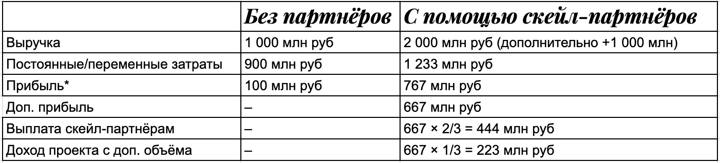 Всё, что скейл-партнёры приносят сверх этого объёма, это почти "чистый бонус": себестоимость на массовом объёме меньше, постоянные расходы уже покрыты.